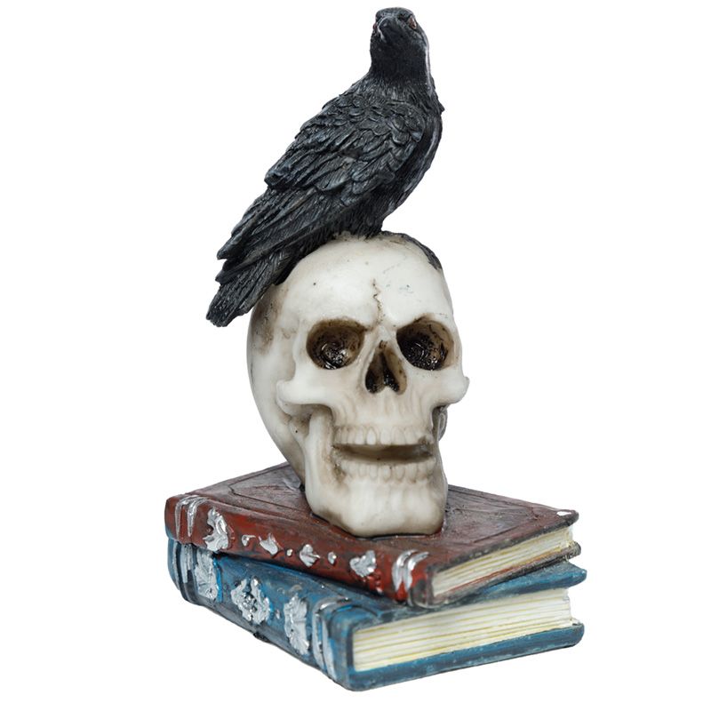 Corvo em pé sobre o crânio e ornamento de livros